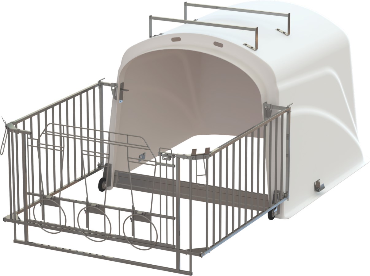 Unkomplizierter Auf-, Ab- und Umbau: Integrierte Räder, eine Griffwölbung auf der Rückseite und die hochklappbare Umzäunung ermöglichen ein einfaches Verschieben der Kälberhütte von Hand. Spezielle Transportschienen auf dem Dach des Iglus erleichtern das Versetzen mit dem Traktor.