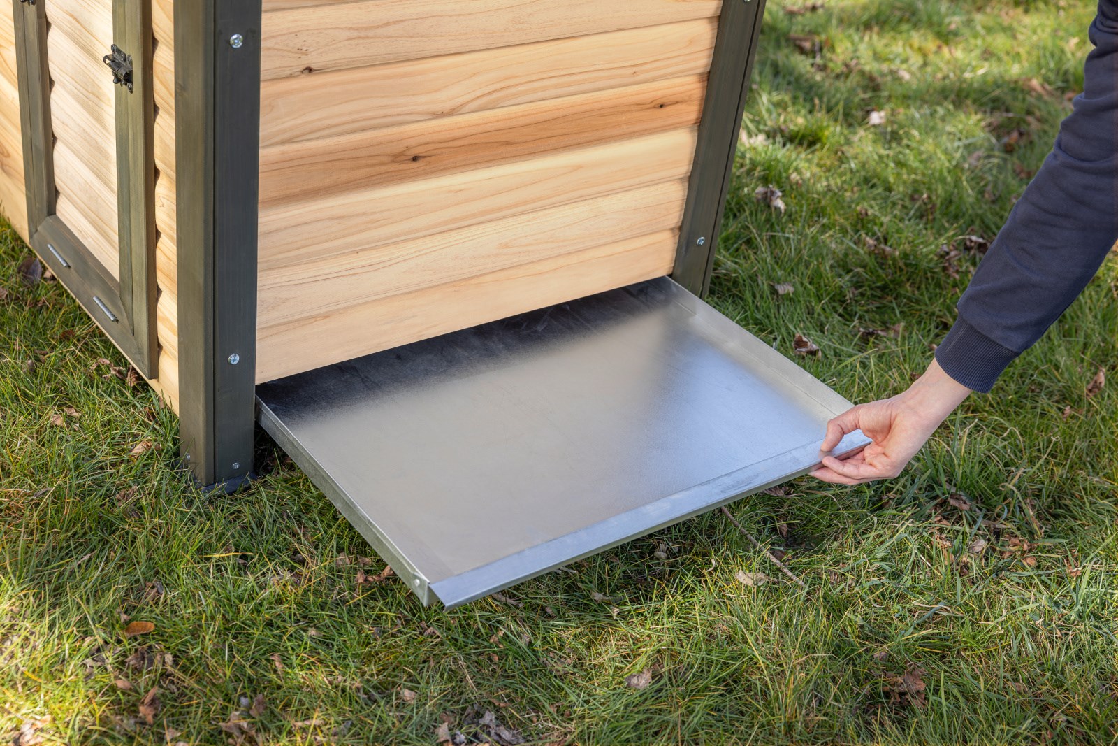 Einfache Reinigung: Eine seitlich herausziehbare, verzinkte Wanne ermöglicht eine unkomplizierte Reinigung. So bleibt der Stall hygienisch und sauber, was das Wohlbefinden der Tiere fördert.