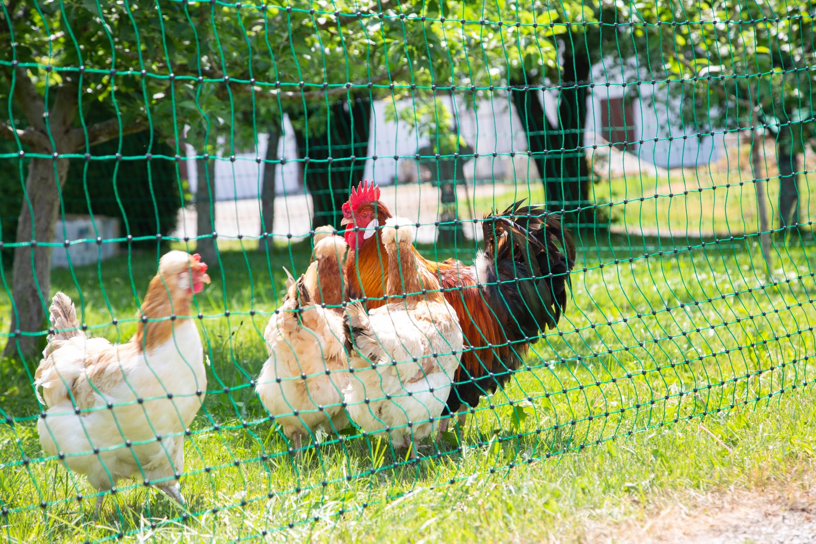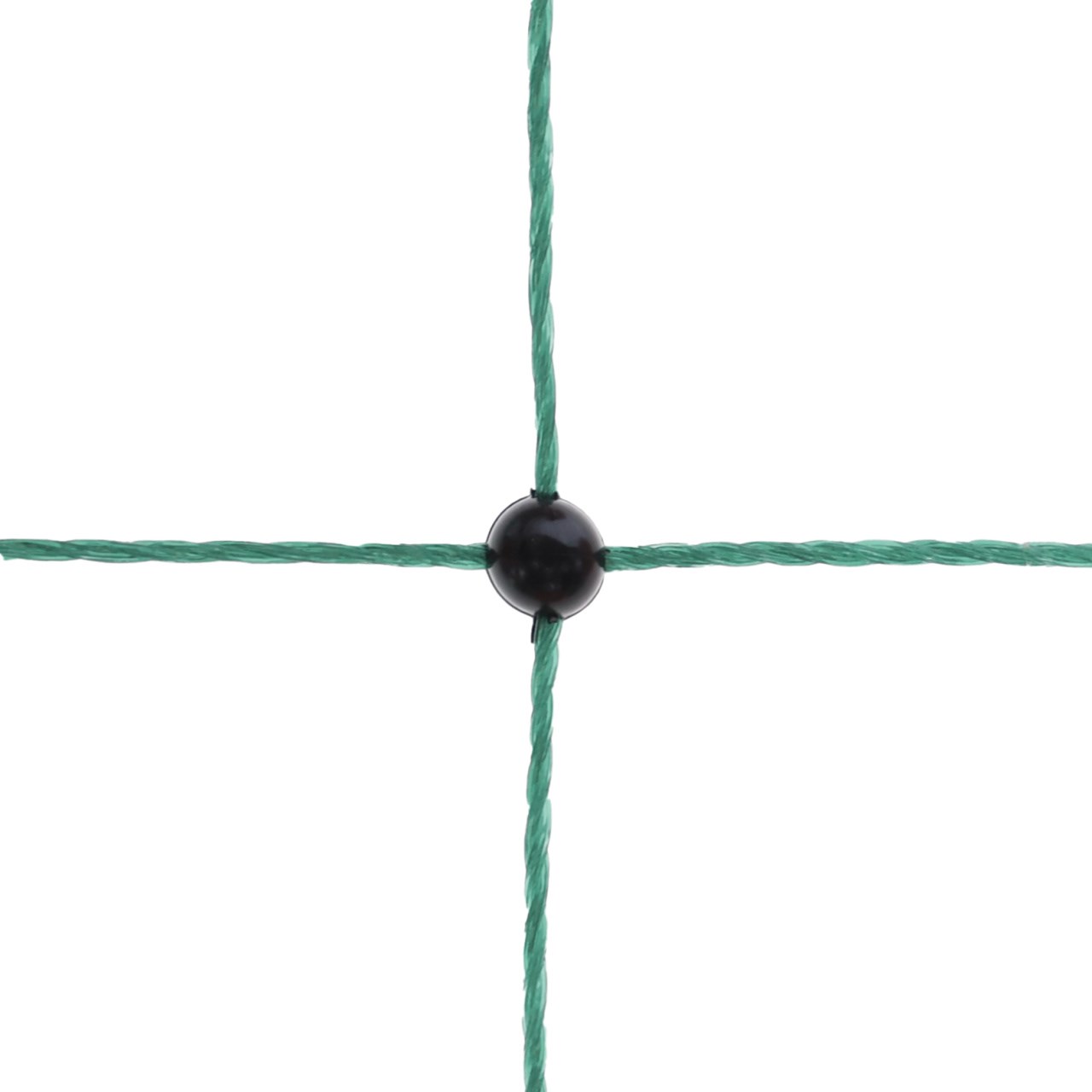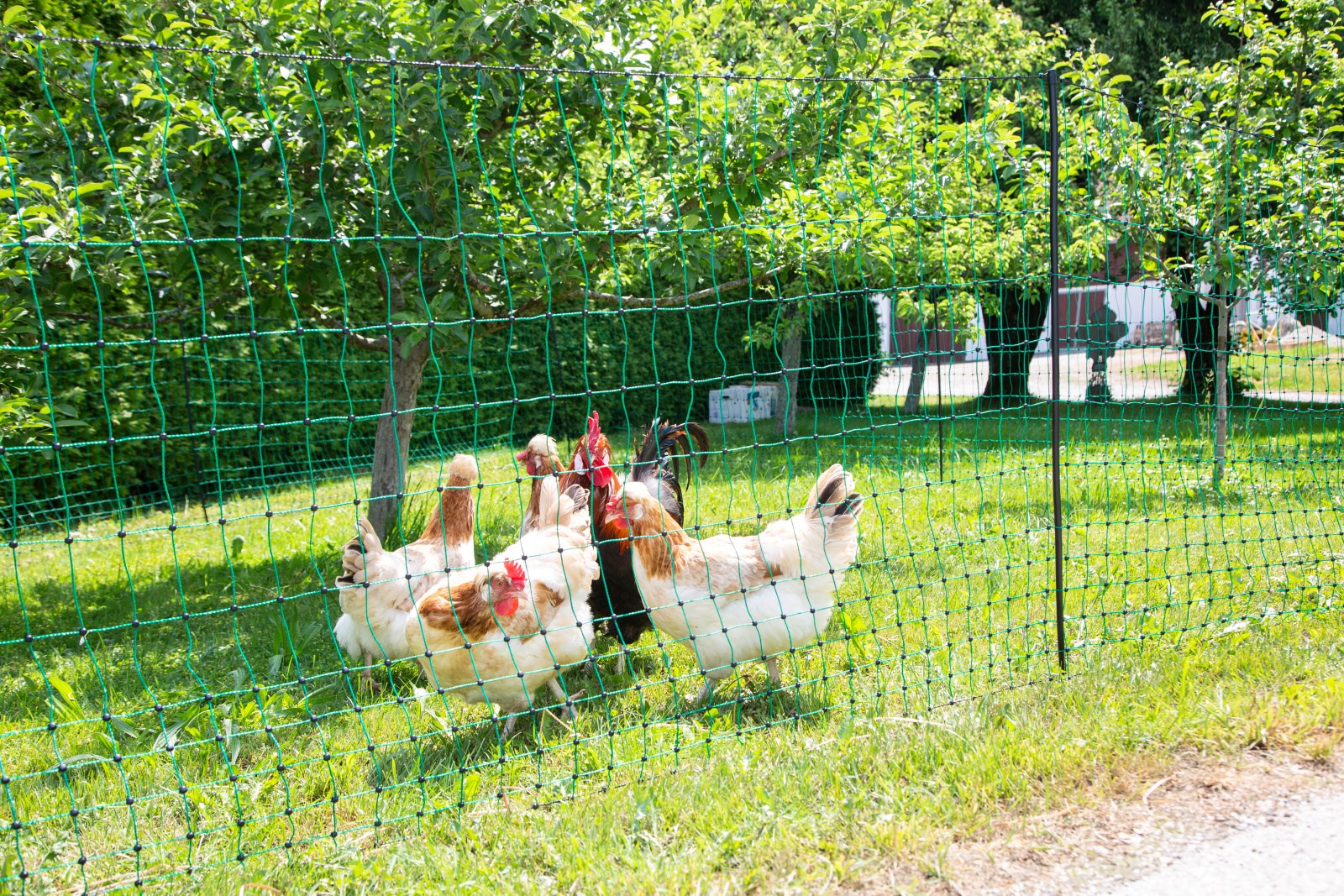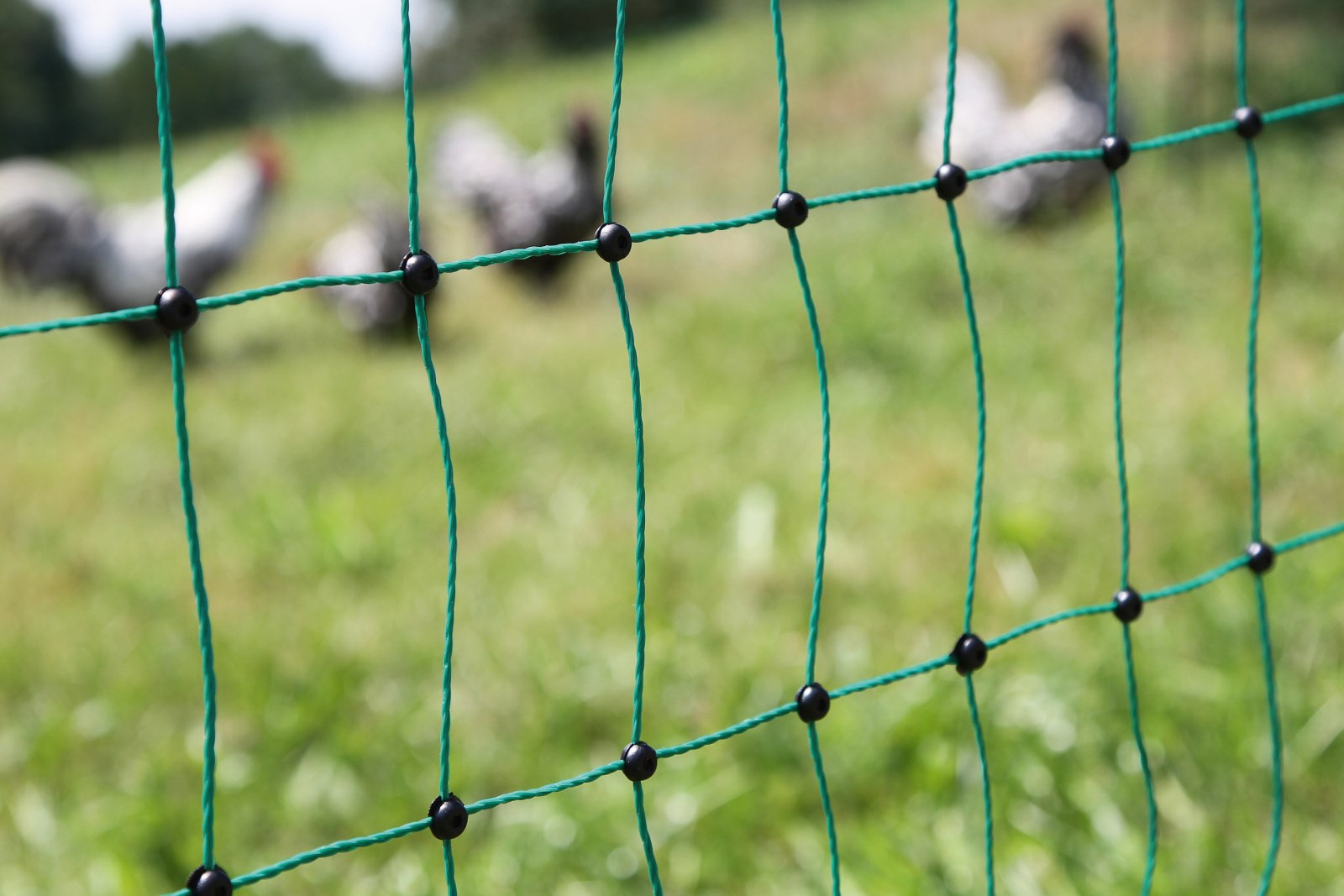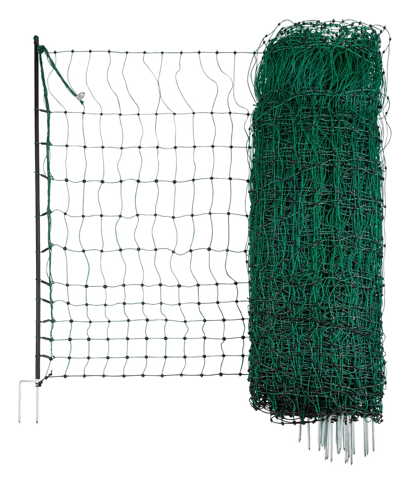 Geflügelnetz elektrifizierbar, 106 cm hoch, mit robusten Pfählen und kleinen Maschen – idealer Weidezaun für Hühner und andere Haustiere im Garten. Für mehr Sicherheit und Flexibilität.