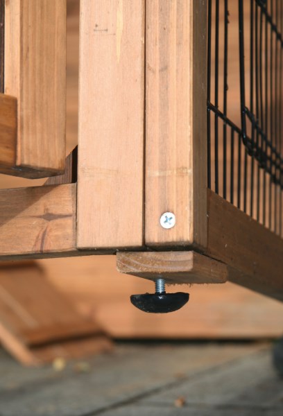 Der Hühnerstall verfügt über ein wetterfestes Bitumendach, kunststoffbeschichtete Böden und 6 einzeln verriegelbare Türen. Zwei Etagen sind durch eine Treppe verbunden, zusätzlich gibt es zwei Schiebetüren zum Gehege.