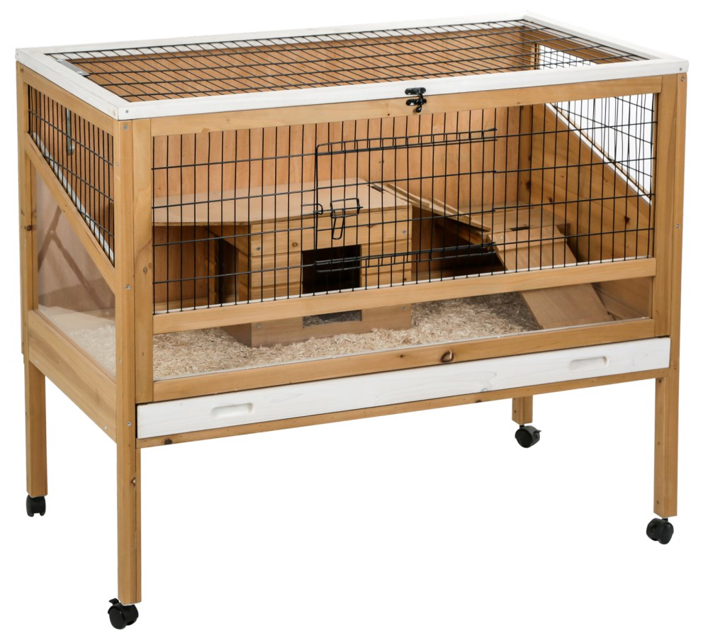 Ein schöner, praktischer Indoor-Käfig mit Rollen für Hasen, Kaninchen, Meerschweinchen und Hamster, der sich durch durchdachte Details auszeichnet: Dank einer erhöhten Umrandung wird die Verteilung von Einstreu in der Wohnung vermieden. Plexiglaseinsätze sorgen für guten Aus- und Einblick.