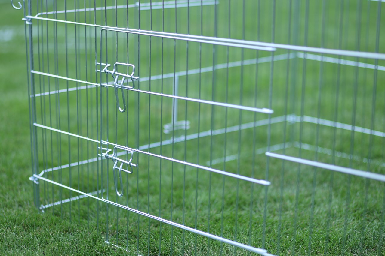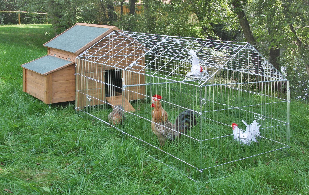 Das verzinkte Metallgehege ist witterungsbeständig und bietet dank Sonnenschutz sowie stabiler Konstruktion optimalen Schutz. Drei praktische Türen sorgen für komfortablen Zugang bei Fütterung und Pflege.