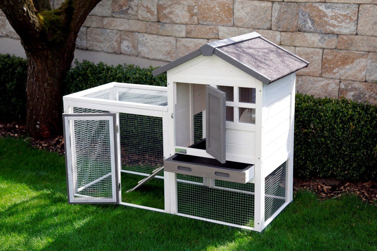 Ein Nagerhaus der Luxusklasse, für Hasen, Kaninchen und Meerschweinchen, die im Freien wohnen. Der Stall ist mit einem großzügigen Auslauf kombiniert, der über eine Rampe zugänglich ist. Er ist wetterfest und leicht zu reinigen.