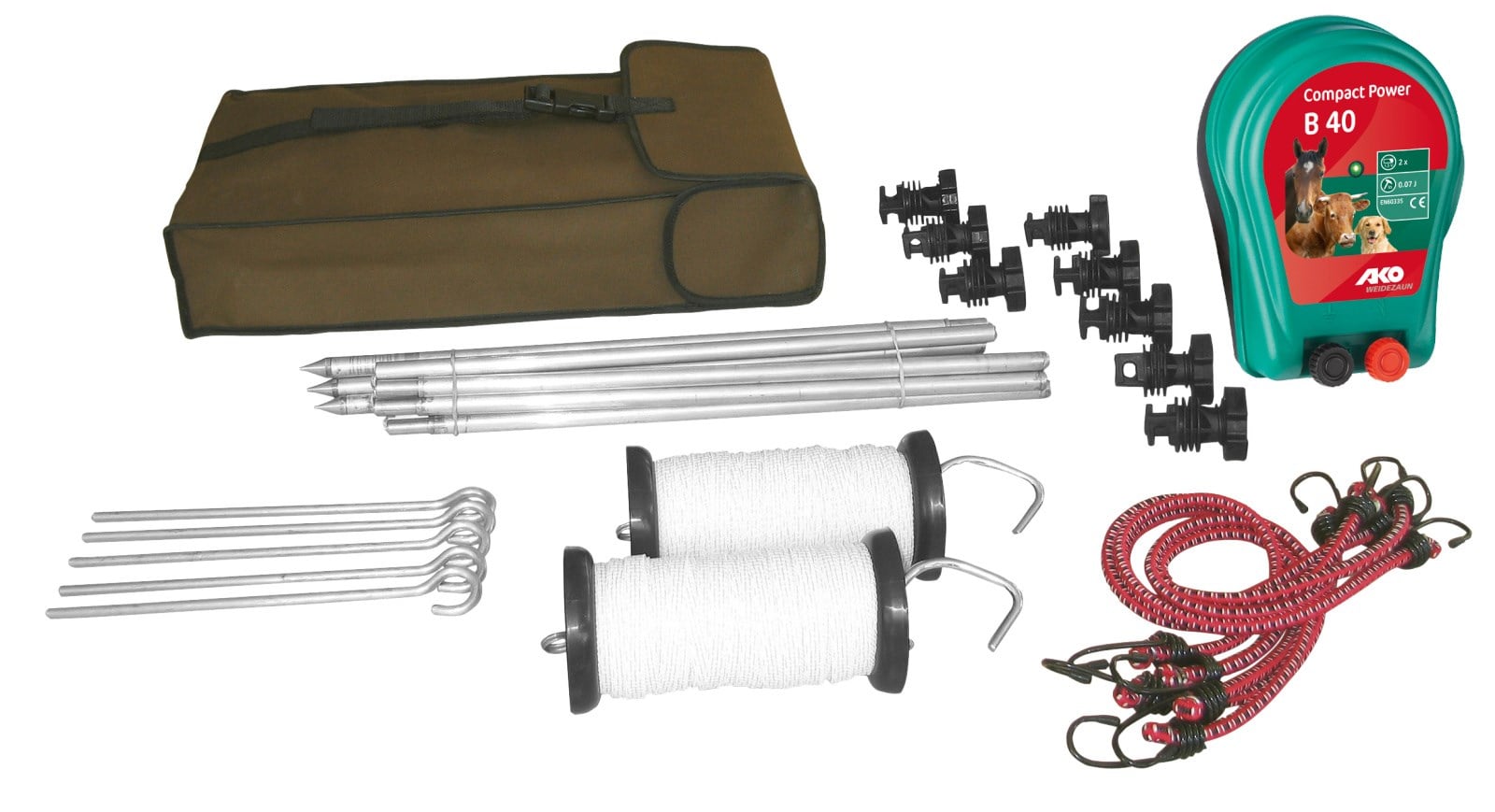 Umfangreiches Zubehör und praktische Verpackung: Das Set enthält das Batteriegerät B 40 (3 V) (inkl. 2 x 1,5 V Batterien), 2 Handgriffe mit je 50 m Band, 4 teilbare Aluminiumstäbe (je 1,15 m), 5 Spanngummis mit Heringen, 8 Anschraubisolatoren, 1 Packtasche.